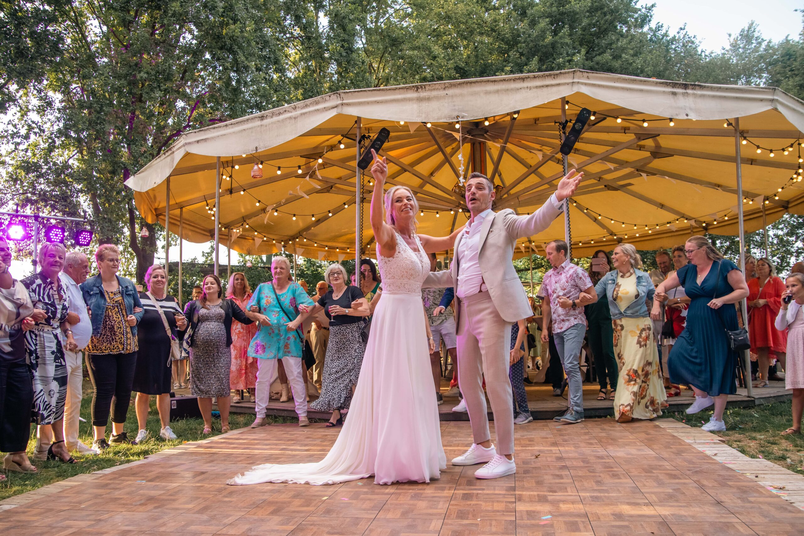 De locatie is volledig buiten, maar met slimme overkappingen en creatieve oplossingen zorgen we dat het feest altijd doorgaat, weer of geen weer. Of jullie nu met dertig gasten komen of tweehonderd: we bouwen samen jullie ideale dag, precies zoals jullie het willen.